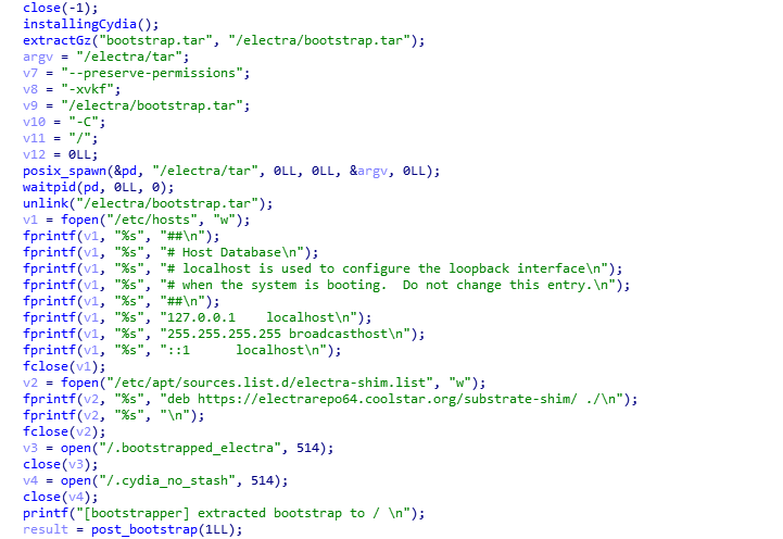 Le code ci-dessus montre Electra qui configure le fichier /etc/hosts et certains repos pour Cydia.