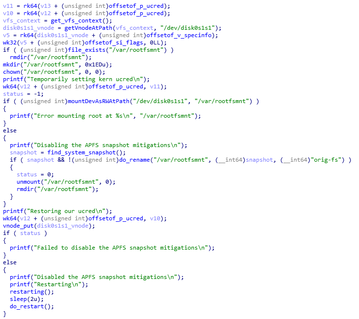 printf("Disabling the APFS snapshot mitigations\n");