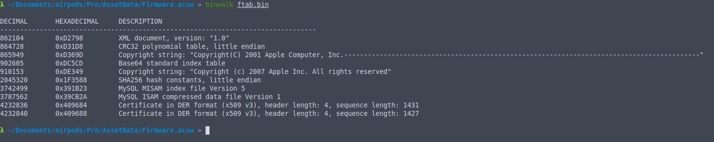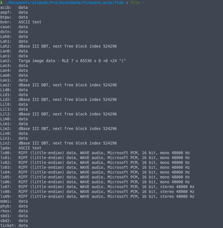 rkosRTKit Operating System, utilisé comme base sur certains cores de l’iPhone 11 Pro. Il est probablement chargé par la BootROM du SoC.aopfAlways-On Processor Firmware.casefirmware du boitier des AirPods.ls00àls09des fichiers au formatwave. Ils correspondent aux sons qu’émettent les AirPods, par exemple lorsqu’on les met à l’oreille, qu’on active Siri, ou encore lorsqu’ils n’ont plus de batterie.lpdacontient les hashes (sha384) des fichiers qui commencent parL(LahX, LanX, LaoX, etc…).bvercontient des informations sur la version du firmware ftab.bin.ticketcertificat DER.