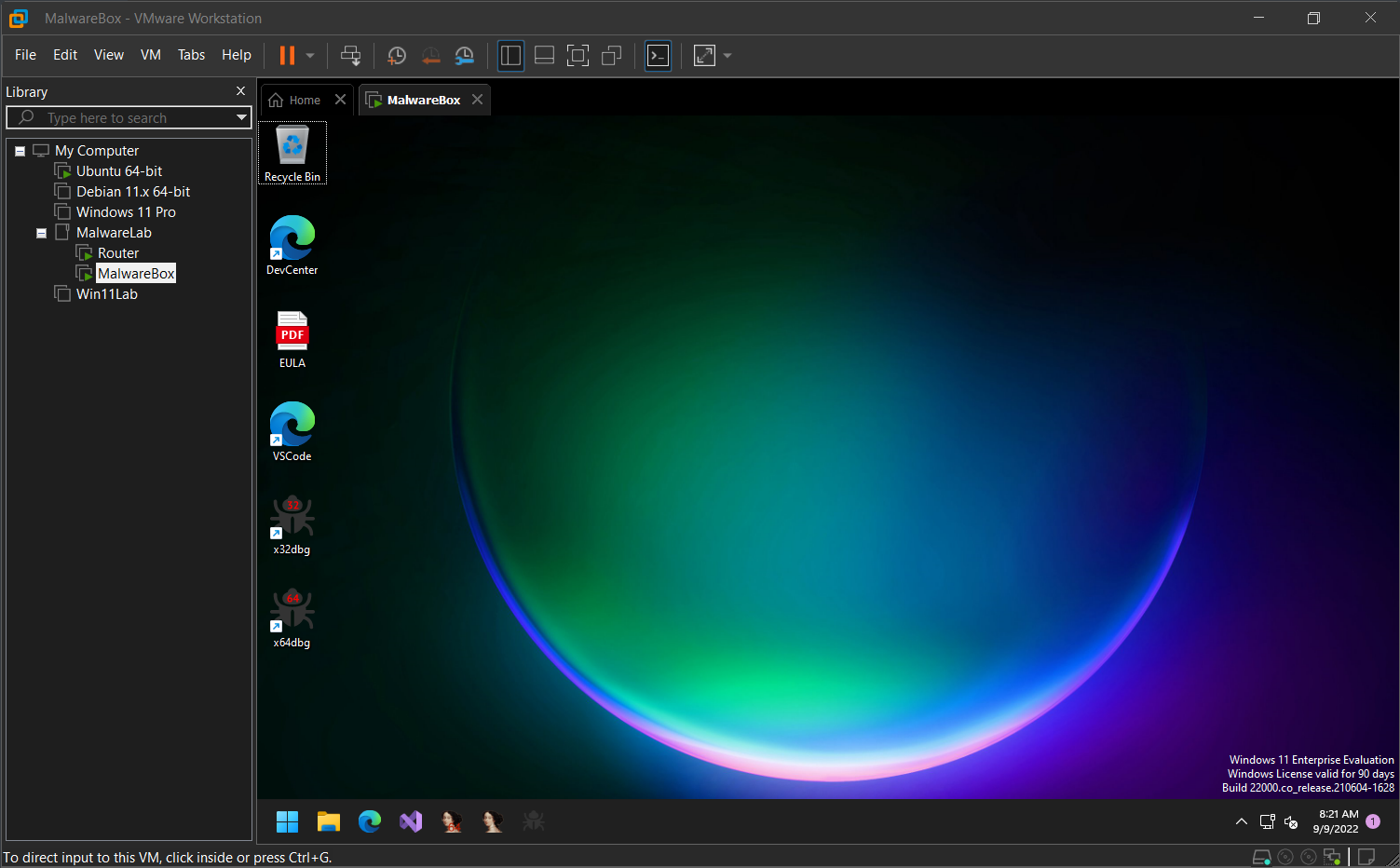 Ce lab contient deux VMs l’une qui sert de routeur, mais sera aussi utile pour l’analyse réseau, l’autre, une VM Windows 11 fournie par Microsoft qui nous permettra de détonner et d’analyser des logiciels malveillants.