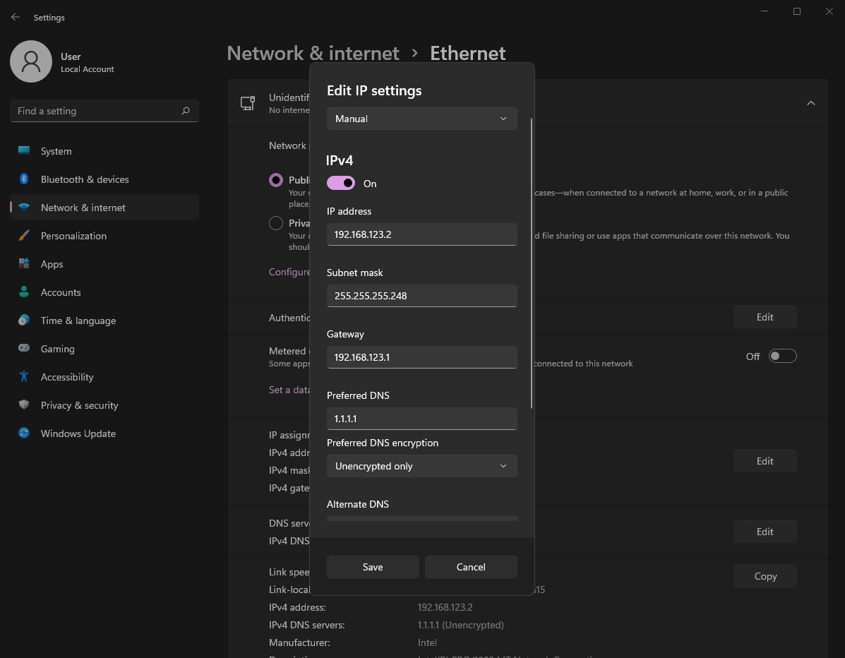 J’ai choisi comme réseau 192.168.123.1/29 pour un maximum de 6 adresses IP utilisables.